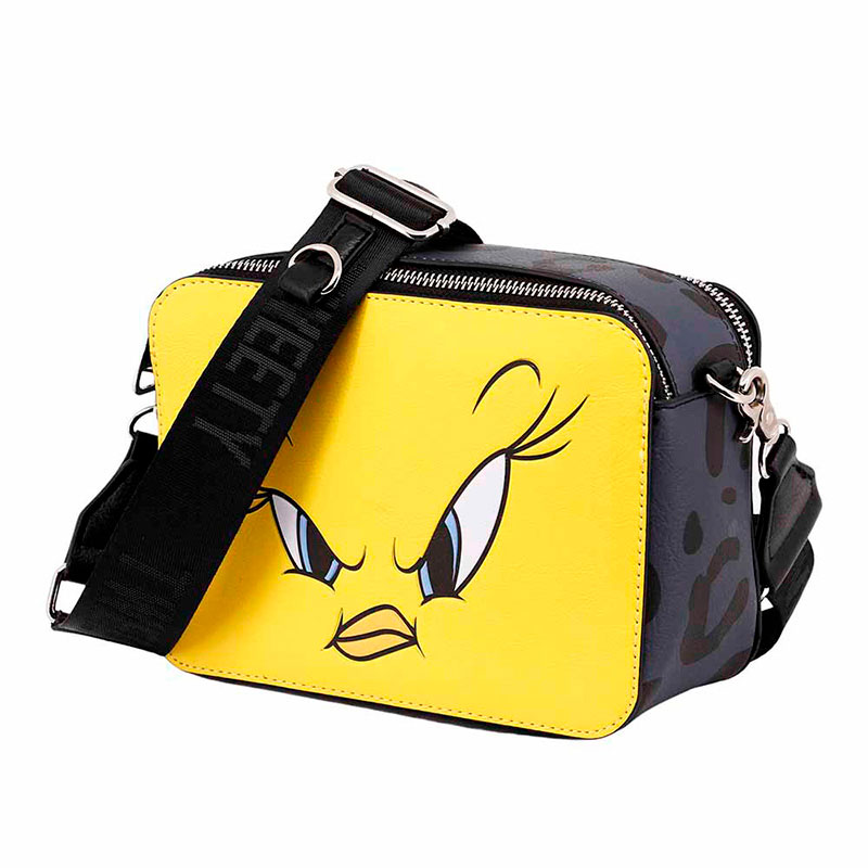 Con cuerpo rectangular, consta de dos cremalleras que dan paso a un único compartimento forrado en poliéster que le confiere un acabado de alta calidad. Posee una correa extraíble y extensible de 1,60cm decorada con el nombre del pajarito Tweetty, personaje inolvidable de Looney Tones. Podrás llevarlo sobre el hombro o como bandolera.