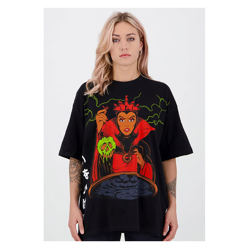 Es un producto fabricado con licencia oficial de Disney, confeccionado 100% en algodón de color negro sobre el que destaca la malvada Reina de Blancanieves, realizando una pócima para envenenar la manzana con la que dormir a la protagonista. Tiene una técnica de impresión de alta calidad.