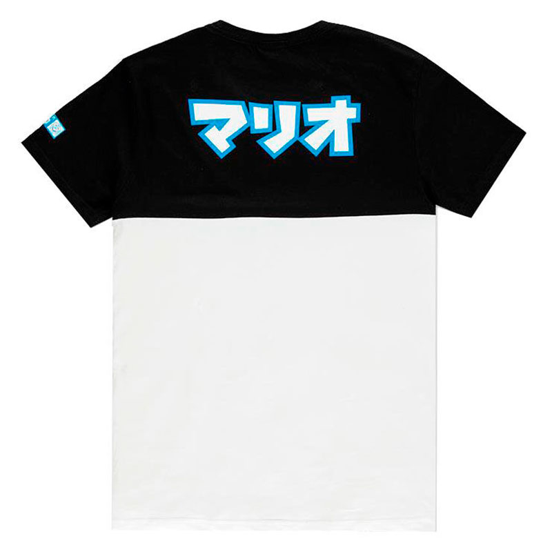 Una camiseta blanca y negra, fabricada en 100% algodón y con una técnica de impresión de alta calidad. Su diseño está dividido en dos colores, la parte de arriba negra con un escudo a la altura del pecho de Super Mario y la parte de abajo blanca con unas sutiles líneas oscuras en diagonal. En la parte de atrás a la altura del diseño negro lleva impresa las letras de Mario en Blanco retocadas en azul.