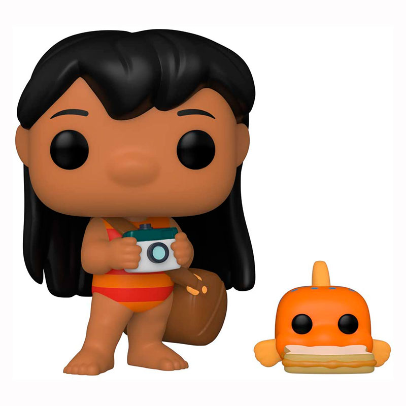 Funko Pop nos ofrece una edición numerada de sus protagonistas: Lilo con Pudge es el Nº 1047 de la colección Pop. Un Funko Pop que consigue recrear con todo detalle la personalidad y carisma de Lilo y Pudge, con su melena larga morena, un bañador de rayas. Este Pop la recrea sosteniendo en una mano su cámara de fotos y su amigo pez naranja Pudge, al lado.