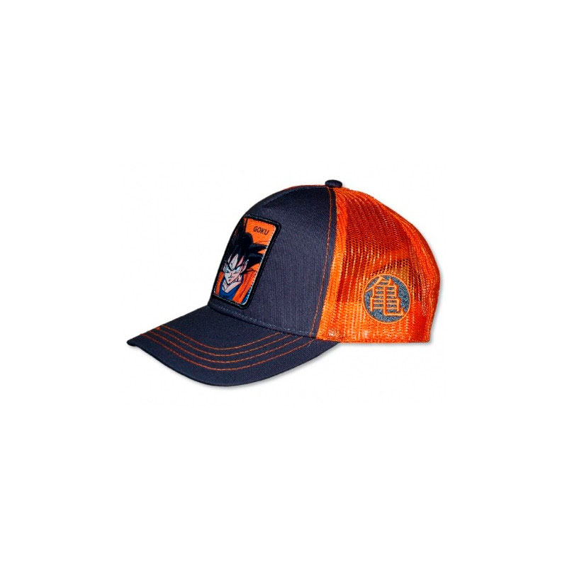 Su diseño es súper actual: la parte delantera en algodón negro con la imagen de Goku bordada en un parche cuadrado, la visera curva, también negra, lleva unas costuras bordadas en hilo naranja y el resto de la gorra confeccionada en una maya de poliéster en color naranja, sujeta en un lateral el Emblema Kame House del maestro Roshi.