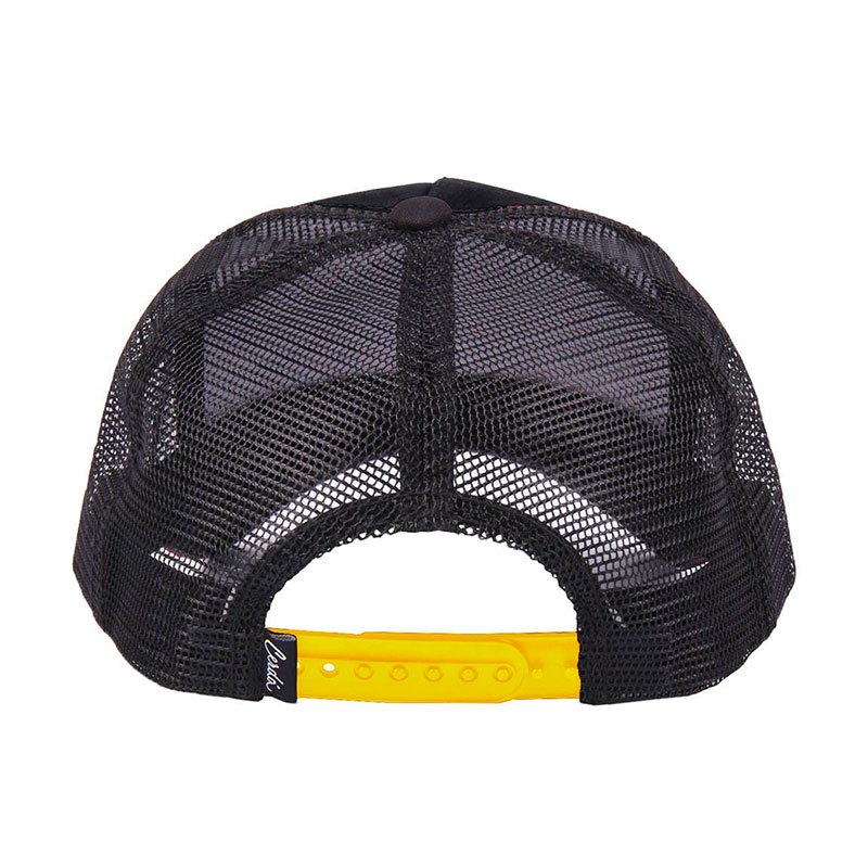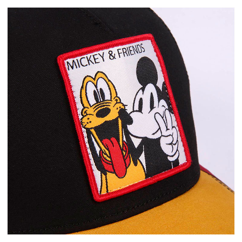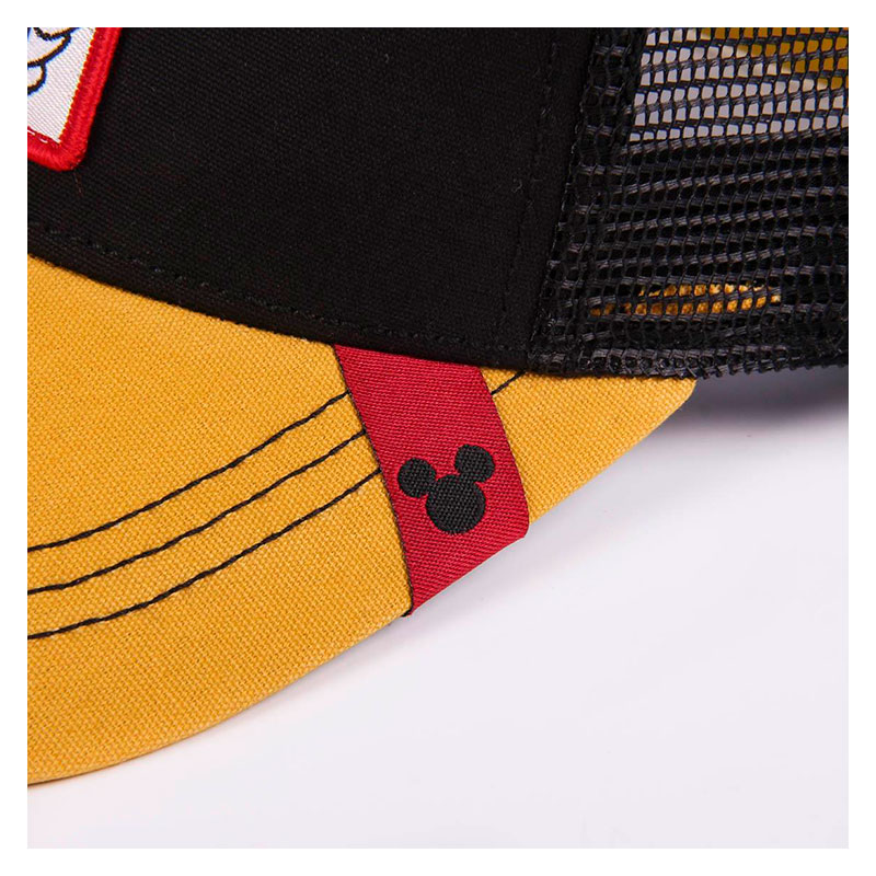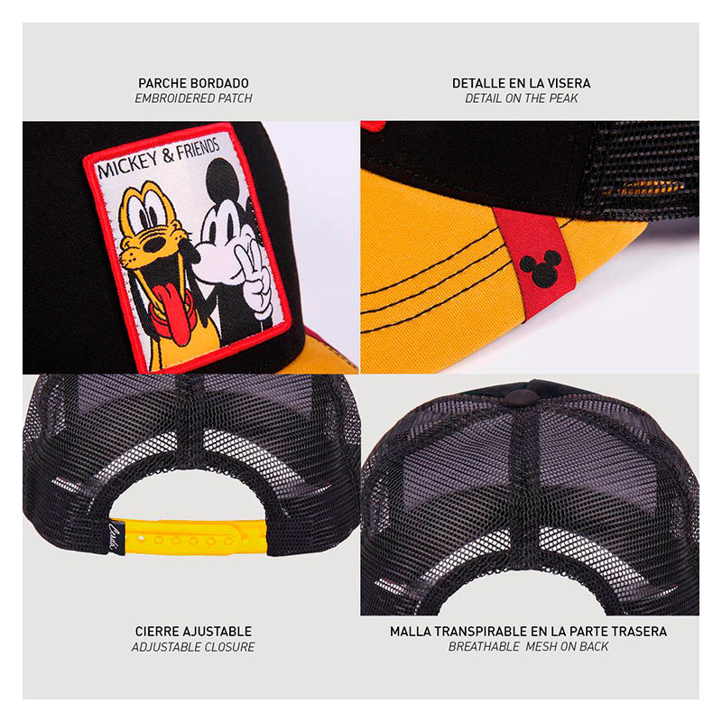 Su diseño es súper chulo. La parte delantera, confeccionada en algodón en color negro, lleva un parche con la imagen de Mickey y su perro Pluto. El resto de la gorra está confeccionada en una malla transpirable de poliéster en color negro, igual que el botón central. La visera en color amarillo hace juego con el cierre ajustable trasero.