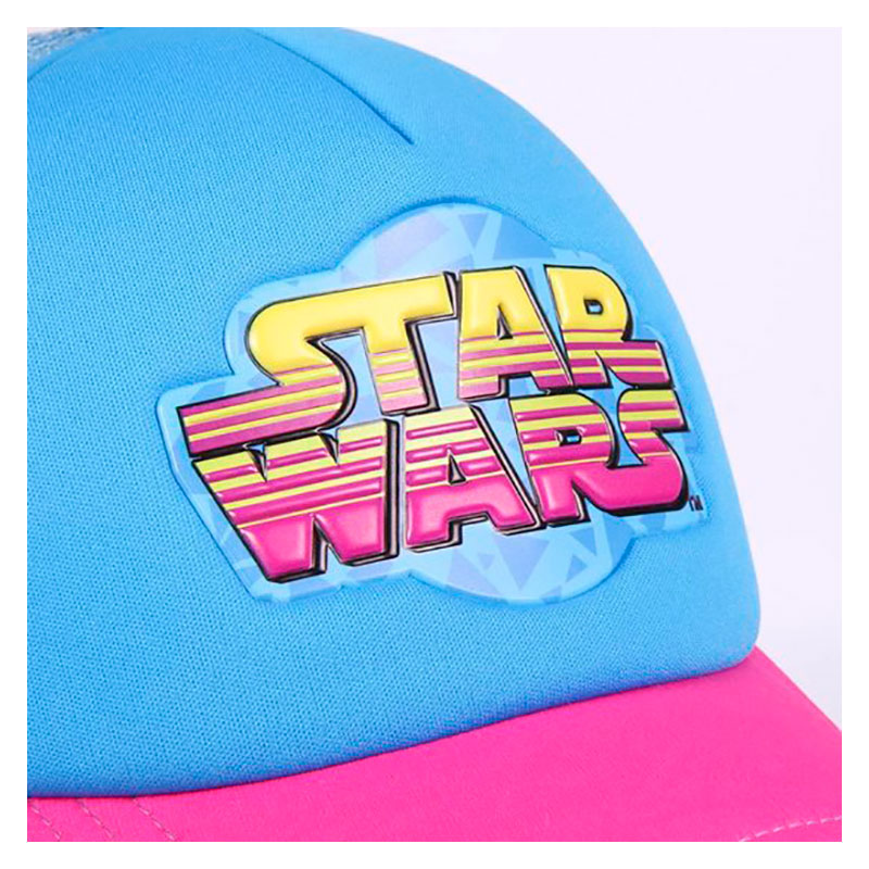 Su diseño Premium es muy bonito. Confeccionada en algodón de colores pastel rosa y azul. En la parte frontal lleva grabado el logo de Star Wars en poliuretano. El resto de la gorra está confeccionada en una malla transpirable de poliéster en color azul, igual que el botón central. La visera en color rosa hace juego con el cierre ajustable trasero.