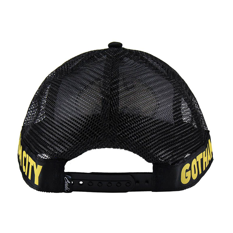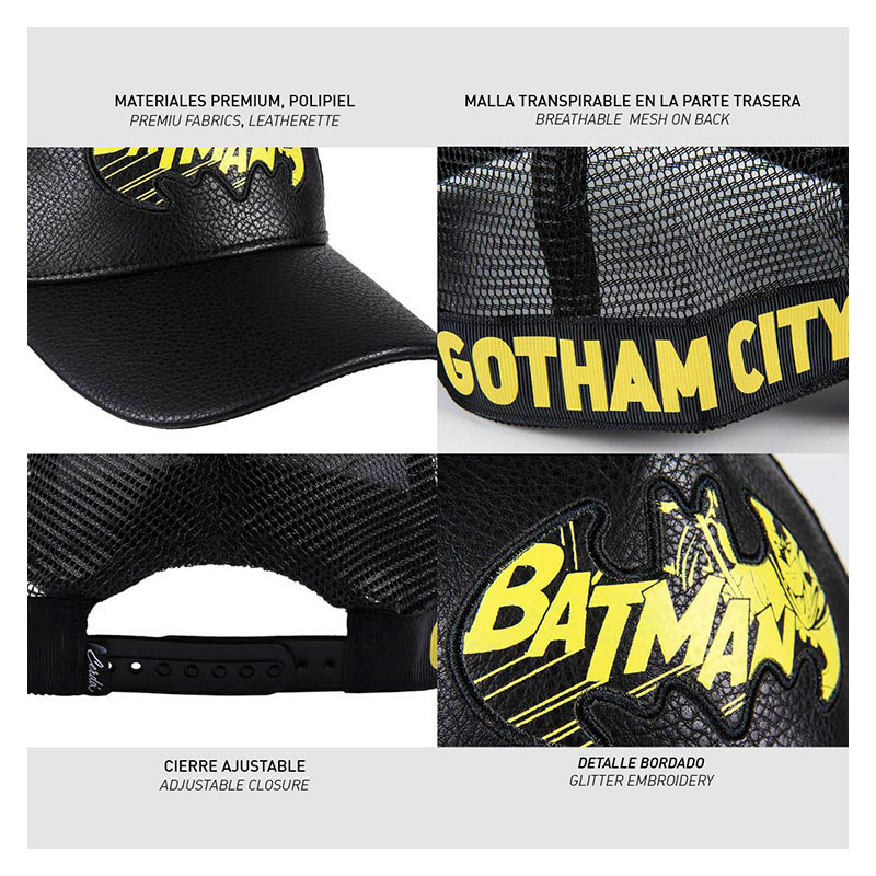 Su diseño es muy elegante.Toda la gorra está fabricada en polipiel de alta calidad, en color negro. En la parte anterior lleva bordado el murciélago de Batman, en cuyo interior aparecen unas imágenes amarillas del cómic de Batman. Discreta y elegante, destaca una cinta alrededor de toda la malla de ventilación y cuerpo de la gorra, en la que se puede leer, en letras de color amarillo: Ghotan City.
