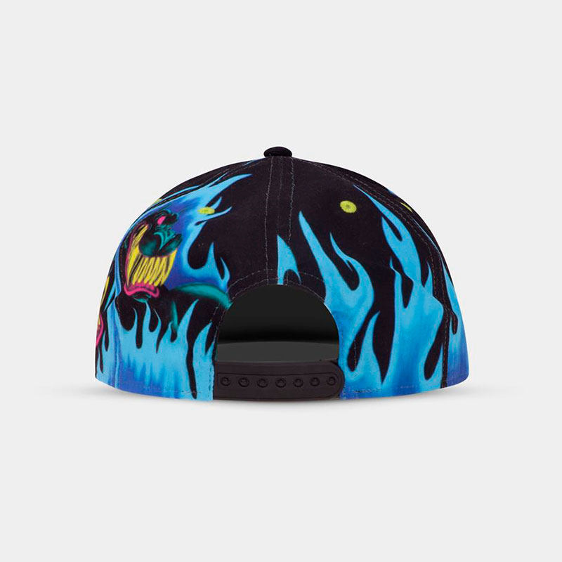 Su diseño es único, confeccionada en algodón, está cubierta de un estampado de escenas de Hades rodeado de llamas azules en la película Hércules y lleva en la parte frontal la cara de Hades y detalles bordados en 3D. Con visera plana, botón central y cierre ajustable a 58cm gracias a su cierre a presión.