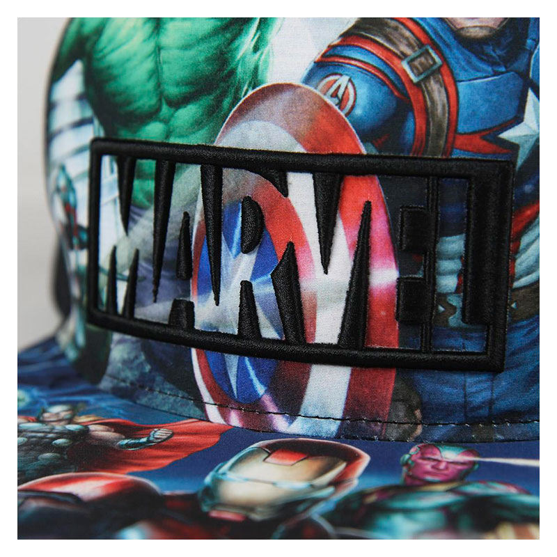 Su diseño es muy actual y juvenil. Toda la gorra está fabricada en algodón 100% de alta calidad con un estampado de los personajes del Universo Marvel en muchos colores y en la parte frontal el logo de Marvel en negro a juego con el botón central y el cierre posterior, ajustable a 53 cm.