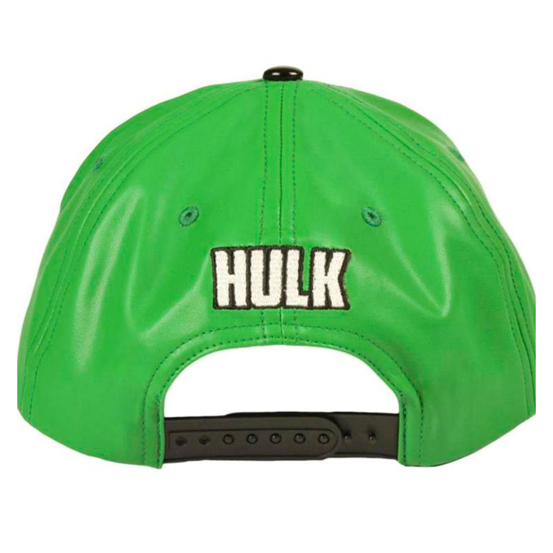 Su diseño es súper actual. Fabricada en polipiel de color verde, representa la cara de Hulk. La parte frontal tiene la cara de Hulk grabada, con el detalle del pelo en color negro satinado, unificando la gorra como si fuera la misma cara de Hulk mirando con sus ojos directamente. Ajustable a 53 cm gracias a su cierre a presión.
