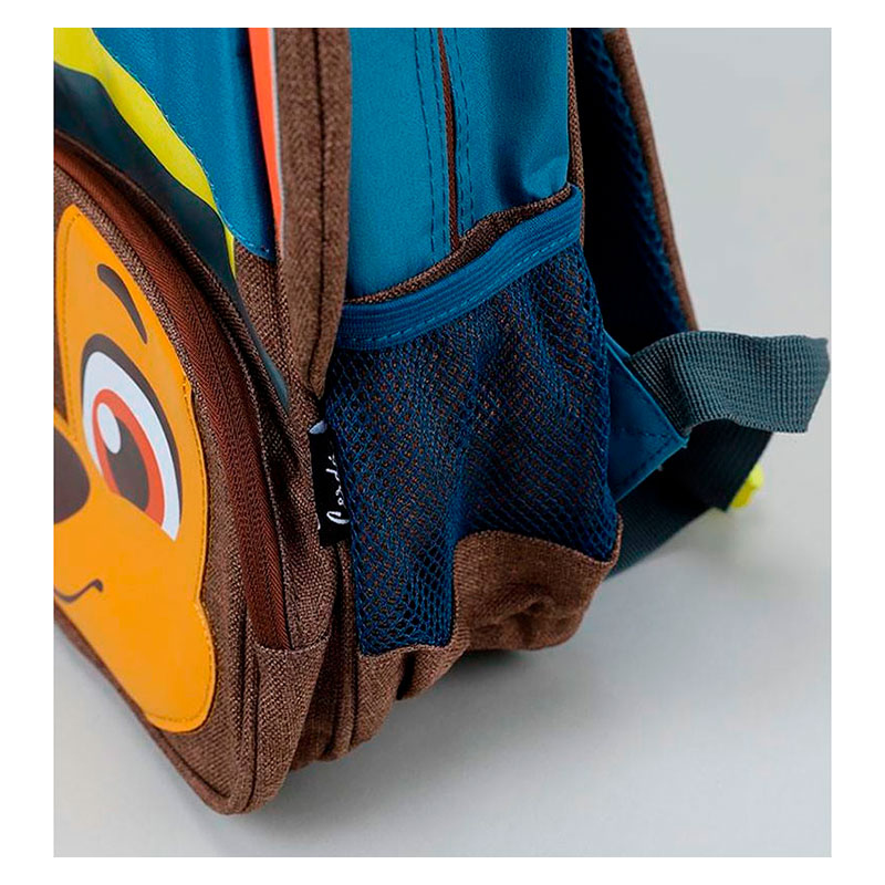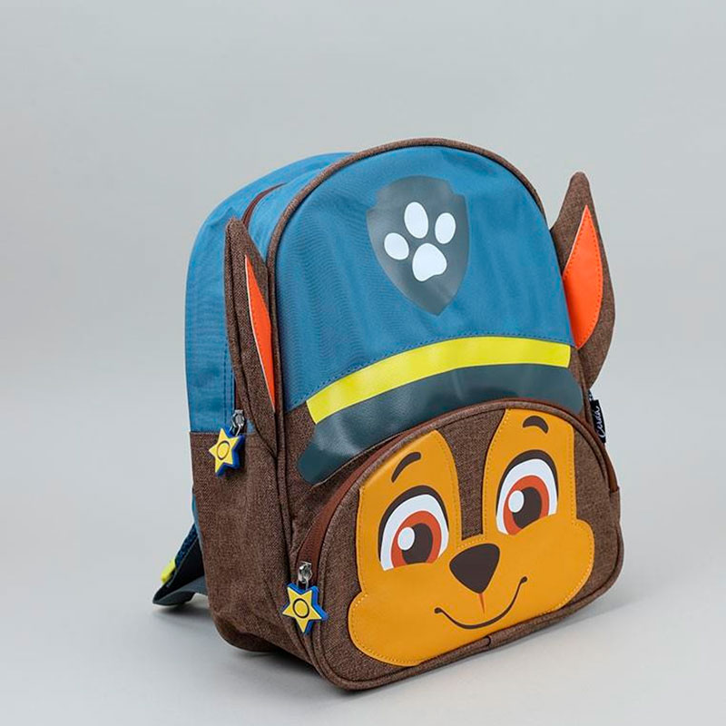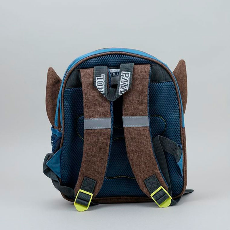 Mochila multicolor fabricada 90% en poliéster y 10% polipiel, cuenta en su parte anterior con la cara de Paw Patrol azul, con sus orejitas puntiagudas saliendo de los laterales y en efecto 3D. Un bolsillo central con tirador de cremallera con la estrella de La Patrulla Canina y también un práctico bolsillo lateral en malla. En su abertura central tiene un cierre de cremallera. Su interior está forrado en poliéster confiriéndole un acabado de alta calidad.