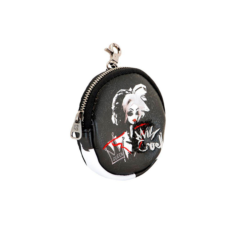 Lo más divertido del diseño, es su forma redondeada, su diseño en color negro con Cruella rodeada de coronas, una cremallera reforzada y también un mosquetón para que lo puedas colgar de donde tú quieras. Asómate a ver nuestra galería de fotos para observar bien todos los detalles.