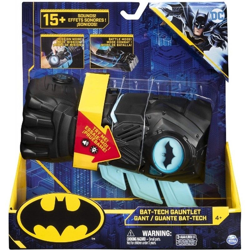 Diseñado en color negro, con la tecnología Bat Tech. Un guante interactivo con dos modos de acción. El botón pequeño activa más de 15 sonidos y luces diferentes y el botón grande activas sonidos cunado golpes con el puño en la mano.