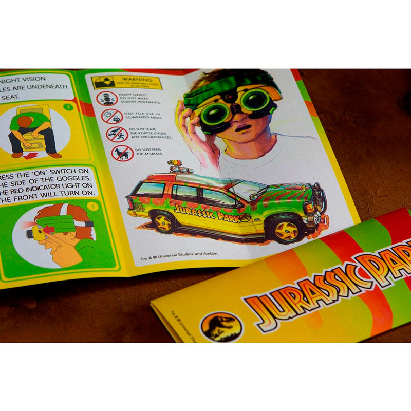 Cada kit lleva: carta de bienvenida al parque, un ticket de entrada, una banderola «Cuando los dinosaurios dominaban la tierra» un mapa tríptico de Jurassic Park, un folleto de instrucciones para uso de las gafas de visión nocturna, un pase VIP con correa, un pin logotipo de Jurassic Park, un parche bordado, una colección exclusiva de chapas de Jurassic Park, una postal exclusiva de Jurassic Park y una pegatina.