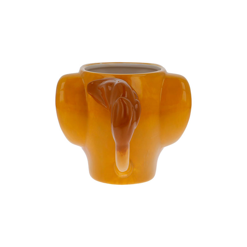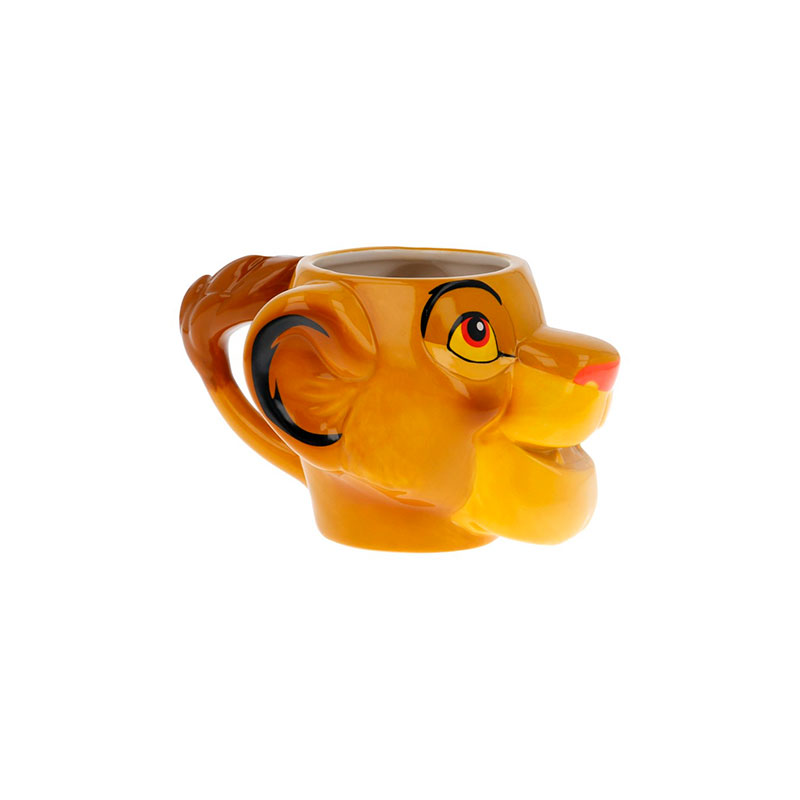 Reproduce la imagen de la cabeza de Simba con todo detalle. No es solo una taza, es también un objeto de adorno. Casi una pequeña escultura del pequeño Simba con su hocico rosa, una gran sonrisa y con sus orejas echadas hacia atrás. La cola peluda hace a la vez de asa con una forma súper divertida. Mira en nuestra galería para ver todas las imágenes y sus detalles.