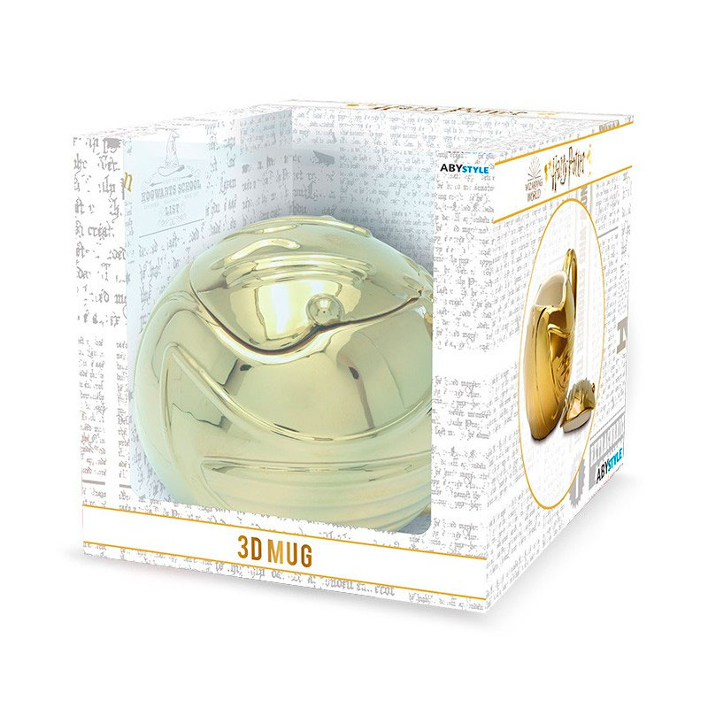 Preciosa taza decorativa 3D de la saga de libros y películas de Harry Potter, con un diseño chulísimo de la Snitch Dorada, la super rápida pelota voladora del juego de Quiddich. Fabricada en cerámica de alta calidad y con 450 ml de capacidad. Una espectacular taza, tanto por la calidad de su material y pinturas como por los detalles pintados a mano de su acabado.