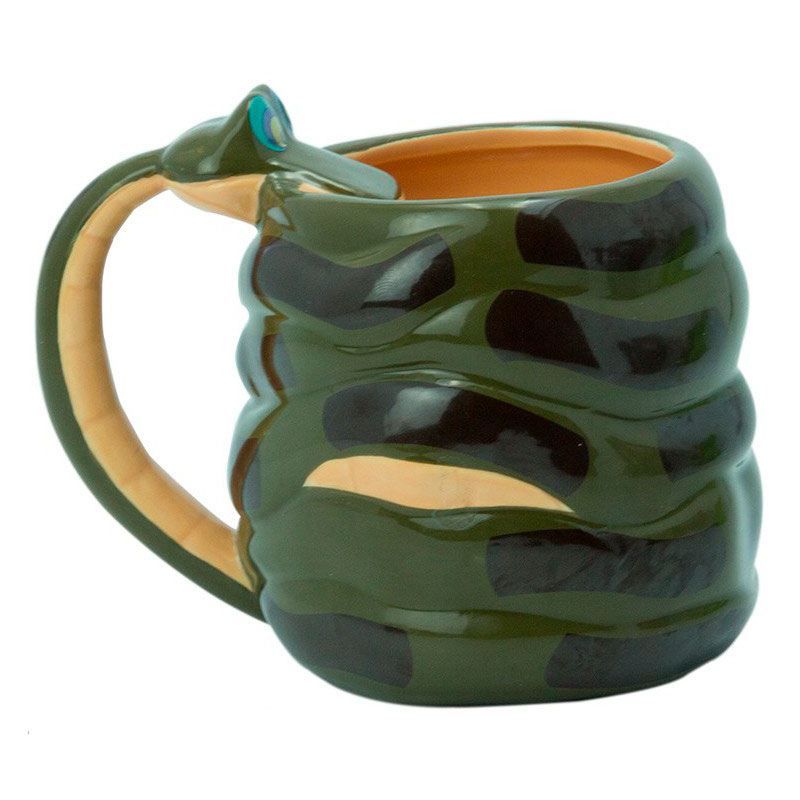 Reproduce el diseño de la Pitón Ka, su interior en amarillo y el exterior en color verde y negra como si estuviera enrollada en la taza y el asa es su cabeza apoyada en el borde de la taza. No es solo una taza, es también un objeto de adorno. Casi una pequeña escultura la serpiente Ka, con sus ojos hipnotizadores mirándote mientras das un sorbo a tu café. Mira en nuestra galería para ver todas las imágenes y sus detalles.