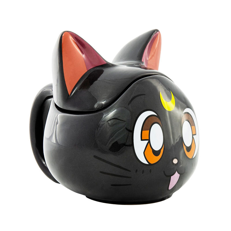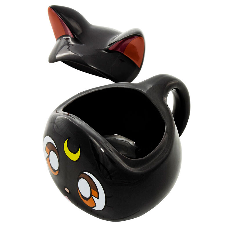 Preciosa taza decorativa 3D de Luna, la gatita negra de la serie manga Sailor Moon. Fabricada en cerámica de alta calidad y con 350 ml de capacidad. Una espectacular taza, tanto por la calidad de su material y pinturas como por los detalles de su acabado. Además, cuenta con una tapa incorporada que te permitirá mantener tu bebida caliente.
