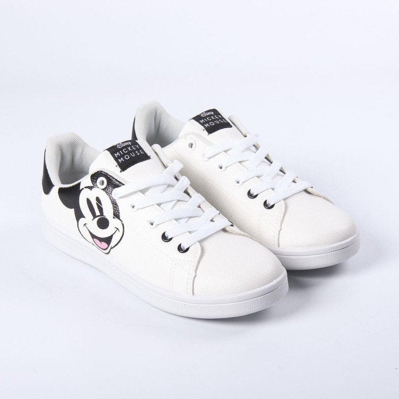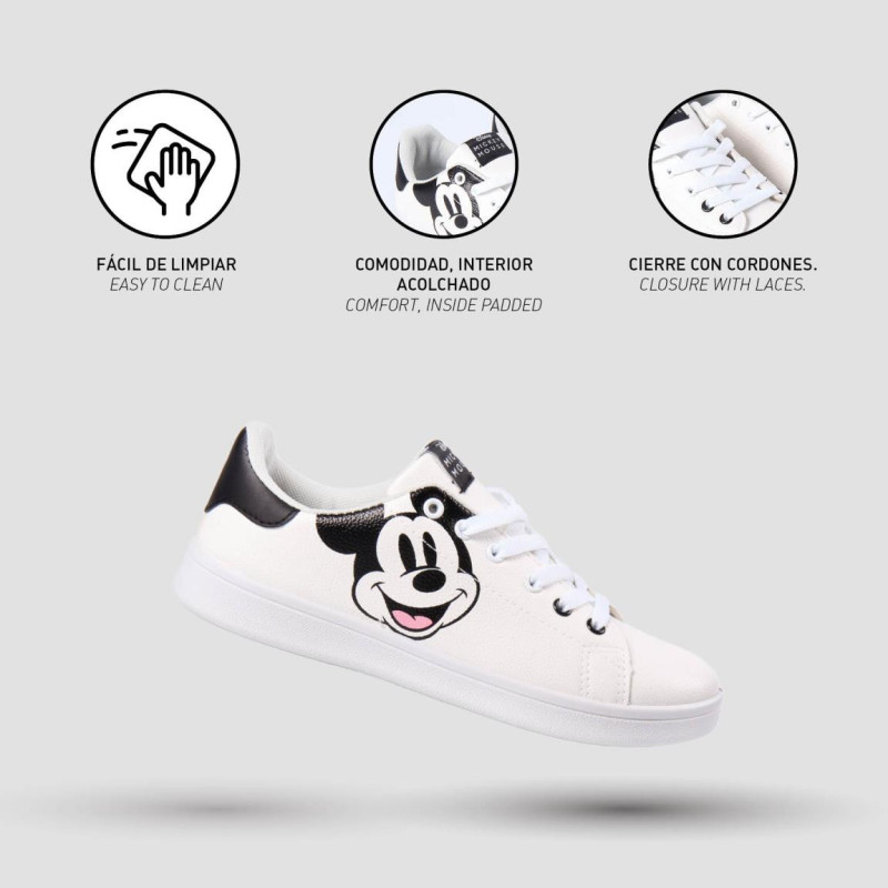Tienen el corte típico de las zapatillas deportivas urbana y un diseño que te encantará porque sobre el color blanco de estas zapatillas, en el lateral, aparece el dibujo de Mickey Mouse en color negro. Sus acabados son de la mejor calidad, el interior es acolchado y cuenta con detalles muy cuidados.
